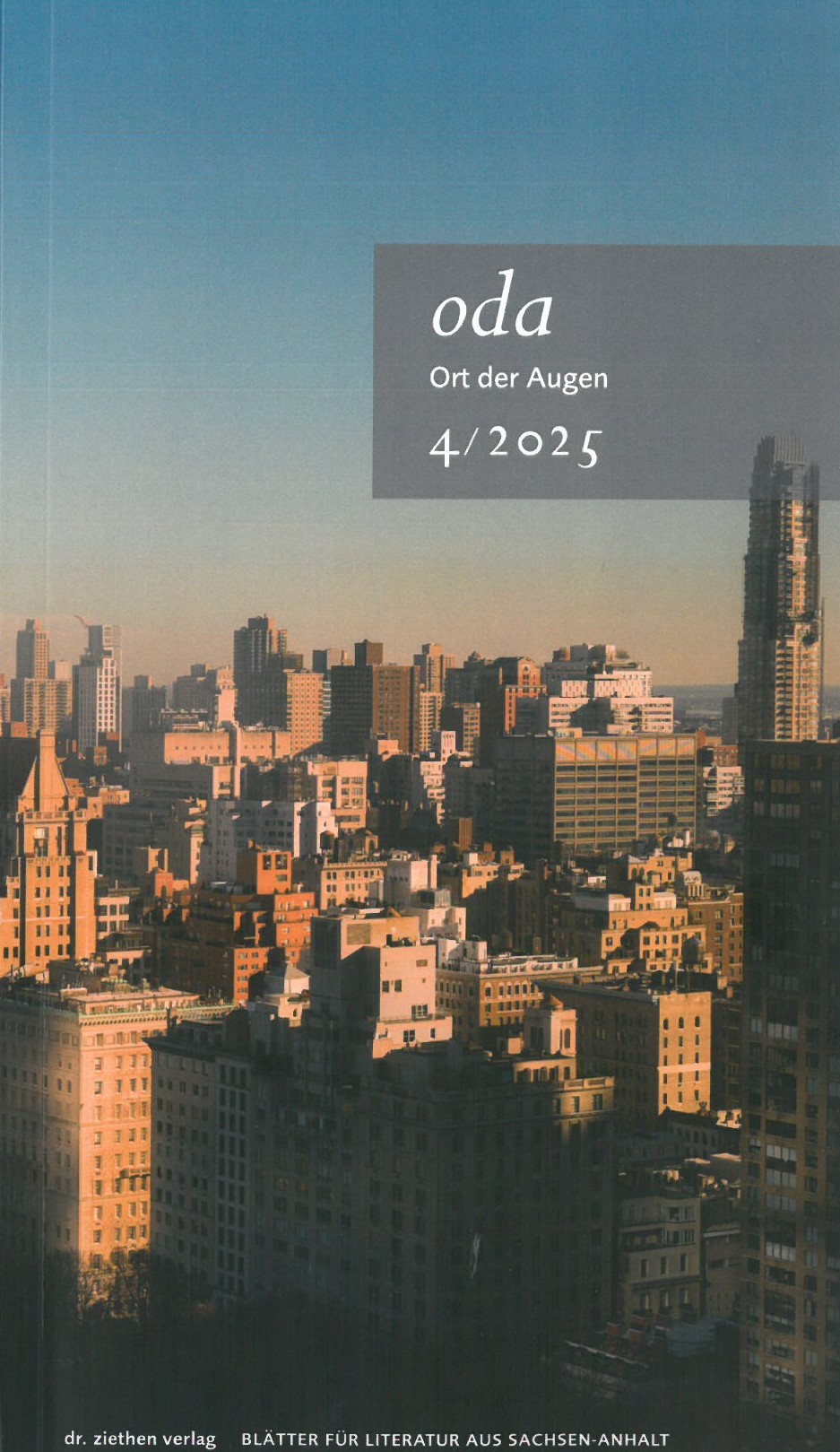 Die Literaturzeitschrift des Landes Sachsen-Anhalt „Ort der Augen“ – OdA erscheint seit nunmehr 30 Jahren und verfolgt das Ziel, über neue Literaturentwicklungen zu informieren, Literatur beispielhaft zu präsentieren und dabei insbesondere Autor*innen aus Sachsen-Anhalt vorzustellen. Sie ist die literarische Visitenkarte des Bundeslandes und bietet der*dem interessierten Leser*in eine Auswahl neuer und unveröffentlichter Texte.